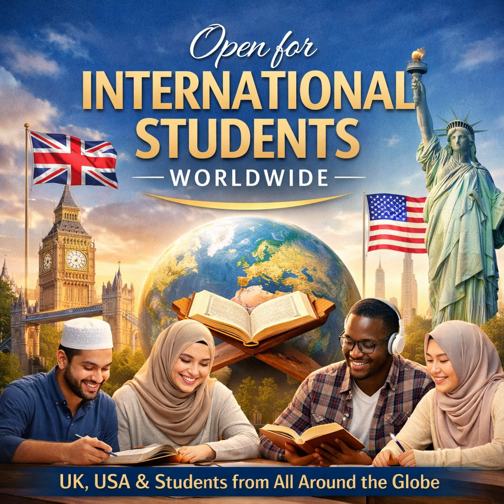Students from the UK, USA, and countries around the world are welcome to join our online and onsite programs. Our courses are accessible internationally, making Islamic education convenient for learners across different regions and time zones. International students receive dedicated guidance, interactive learning support, and a warm, inclusive academic environment.
